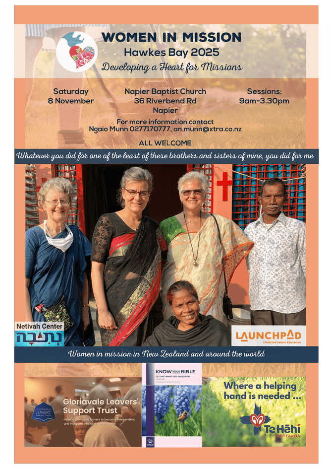 We’re excited to let you know that one of GC3's mission partners, Ruth (DPG Day 14), will be speaking at the Women In Mission event in Hawkes Bay in November! This is a fantastic opportunity to connect, ask questions, and discover more about missions Come along, get inspired, and be part of the conversation!