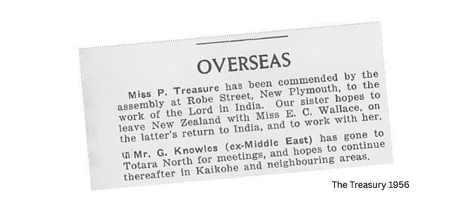 In The Treasury of August 1956, Phyllis Treasure’s name appears under the heading Overseas, briefly recording that she was commended by the assemblies at Armagh Street, Quinn’s Road, Christchurch and Robe Street, New Plymouth for overseas service in India. In true economical word count of that print era, information was limited. There is no commentary on this lifetime commitment and its possible significance. The notice simply marks a step taken.